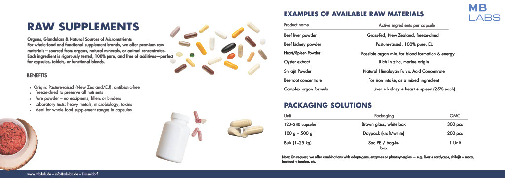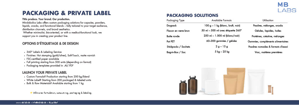 MB Labs (Mindabolics GmbH) specializes in manufacturing and supplying private label and bulk dietary supplements and functional foods. Production adheres to GMP and ISO standards, ensuring Clean Label quality with no unnecessary additives or fillers.