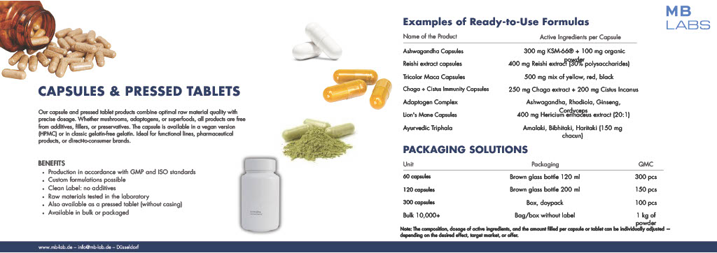 • Capsules & Pressed Tablets: Includes formulas like Ashwagandha, Reishi, Maca, and Lion’s Mane, available in vegan (HPMC) or classic gelatin capsules.