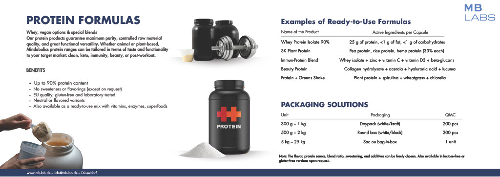• Protein Formulas: Customizable blends of Whey and vegan proteins (pea, rice, hemp), including specialty options for immunity or beauty.