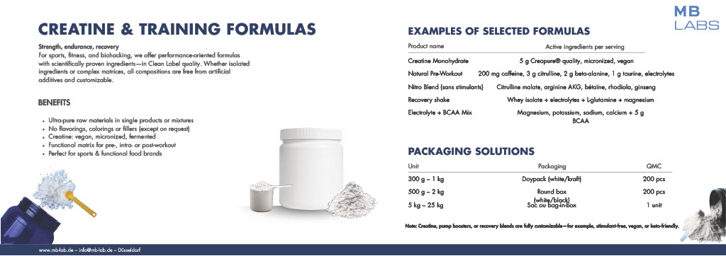 • Creatine & Training Formulas: Performance supplements like Creatine Monohydrate (Creapure®), pre-workouts, and recovery shakes.