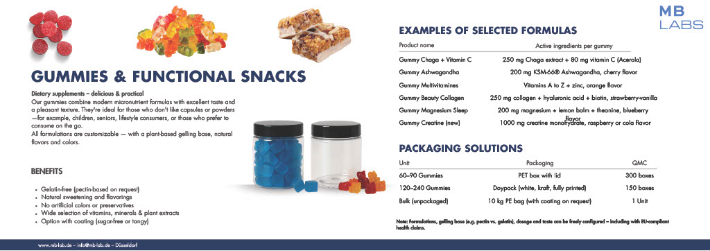 • Gummies & Functional Snacks: Delicious, practical supplements, available with a gelatin-free, pectin-based gelling base and natural flavors.
