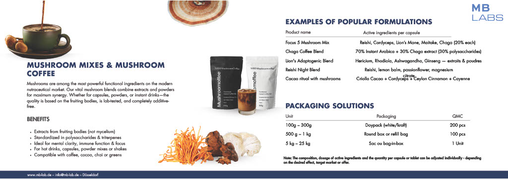 • Mushroom Mixes & Coffee: Extracts from fruiting bodies for mental clarity, immune function, and focus, often compatible with coffee or cocoa.