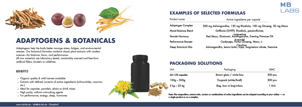 • Adaptogens & Botanicals: Formulas for managing stress and enhancing performance, featuring extracts like Rhodiola, Ginseng, and Ashwagandha.