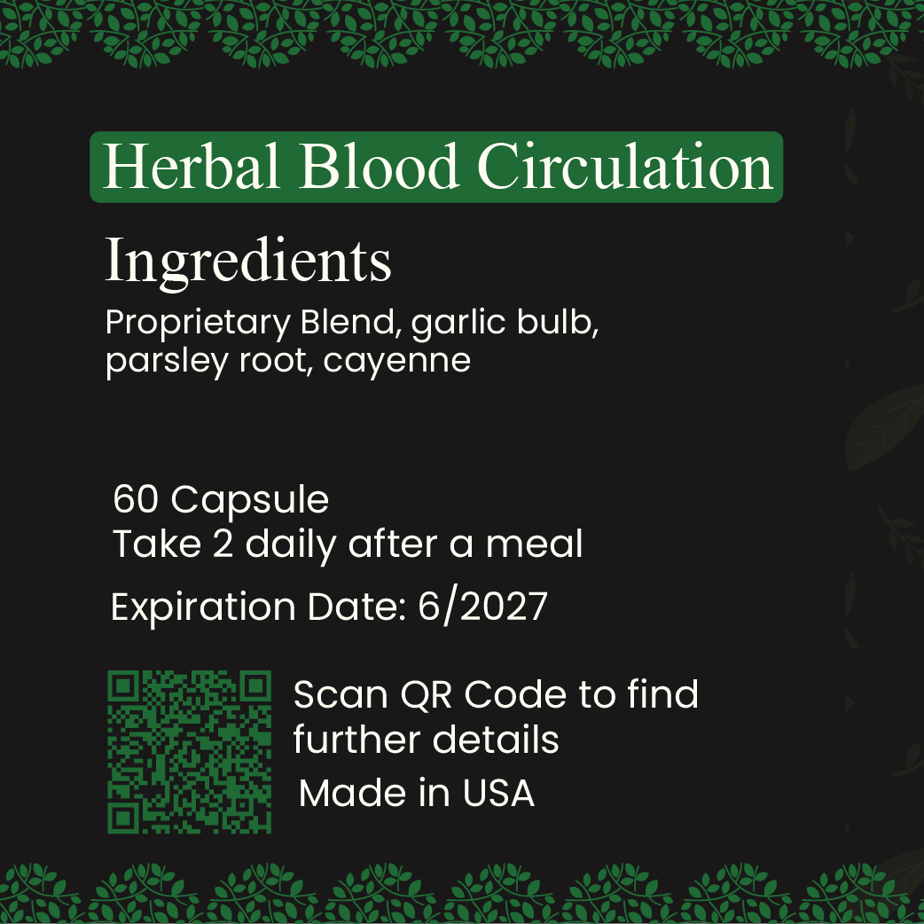This potent blend features Garlic Bulb, Parsley Root, and Cayenne, known for their powerful cardiovascular benefits. Garlic Bulb is renowned for its ability to promote healthy arteries and reduce inflammation. Parsley Root acts as a natural diuretic, helping to detoxify and improve blood flow. Cayenne, a spicy herb, stimulates circulation by dilating blood vessels and improving oxygen delivery. Together, these ingredients work synergistically to support the cardiovascular system, increase blood flow, and maintain healthy blood pressure levels. Herbal Blood Circulation is an all-natural, safe supplement that helps you achieve optimal circulatory health, enhancing your energy and well-being every day.