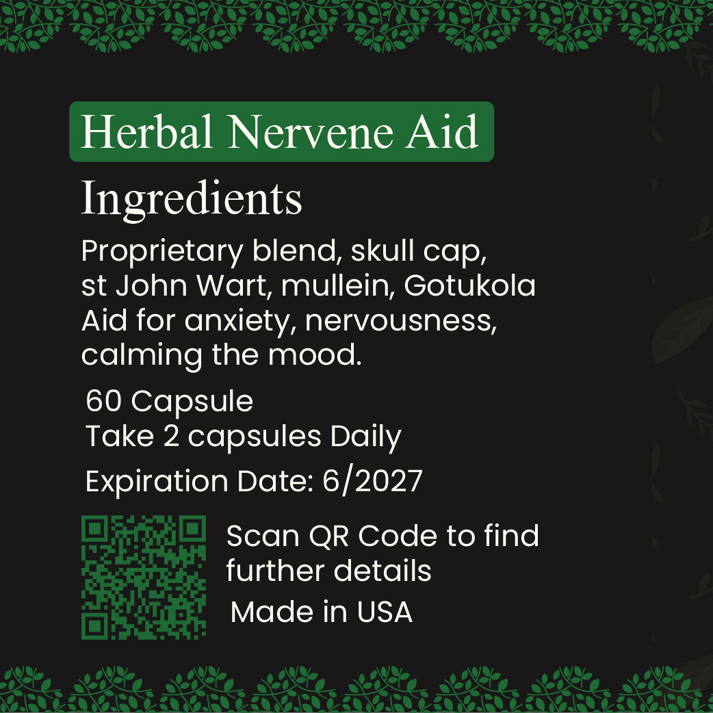 Herbal Nervene Aid is the perfect choice for those seeking natural relief from emotional tension and nervous energy. This expertly formulated blend combines time-honored herbs like Skullcap, St. John’s Wort, Mullein, and Gotu Kola—each carefully chosen for their ability to calm the nerves and uplift the spirit. Whether you’re dealing with occasional anxiety, low moods, or overactive thoughts, this supplement works to create emotional balance without the use of harsh chemicals or sedatives. It helps regulate the body’s stress response while supporting mental focus and relaxation. Take two capsules daily as part of your wellness routine and allow nature to help you reset, recharge, and realign. With Herbal Nervene Aid, tranquility is just a dose away.