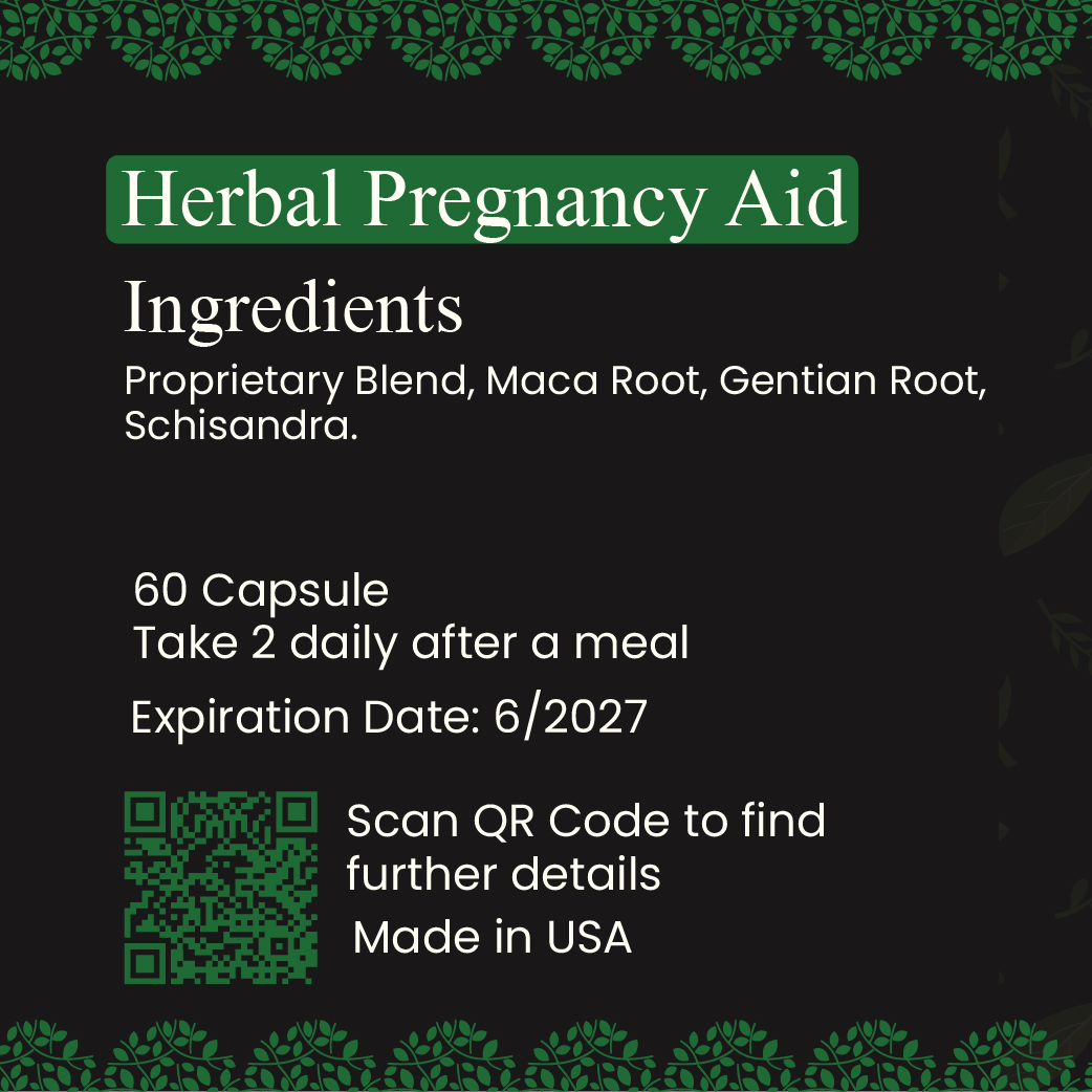 The Herbal Pregnancy Aid capsules combine potent natural herbs that work synergistically to enhance fertility and reproductive health. Maca Root is renowned for its hormone-balancing properties and ability to boost energy and stamina. Gentian Root supports digestion and helps the body absorb vital nutrients needed for reproductive function. Schisandra is an adaptogen that enhances overall vitality, reduces stress, and improves endurance, which is critical during the conception phase. Together, these herbs promote a balanced endocrine system, increase reproductive organ function, and support cellular health. Herbal Pregnancy Aid is an ideal choice for those looking for a natural, holistic approach to reproductive wellness and fertility support, helping you feel your best every day.