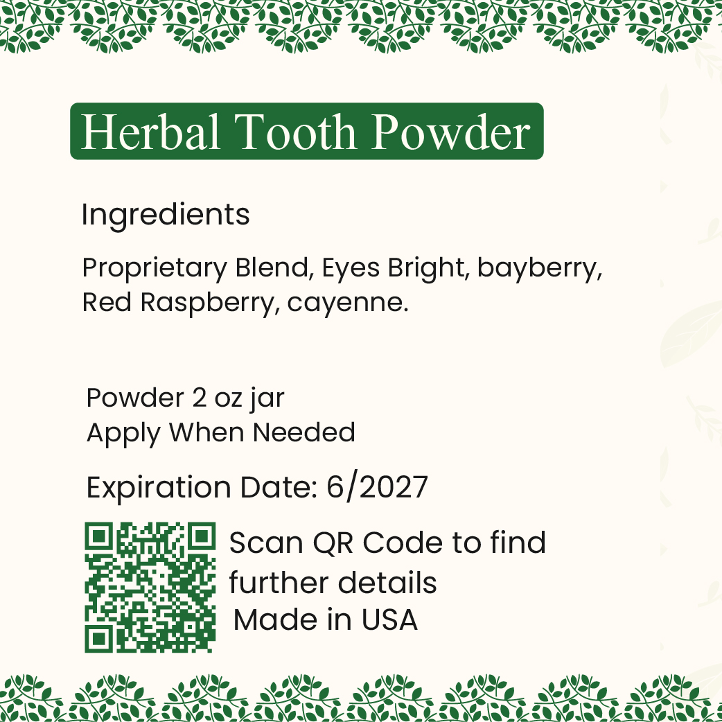 Herbal Tooth Powder by DNA Global Herbs is a natural oral care solution designed to promote healthy teeth and gums. This unique powder helps combat cavities and supports the reversal of tooth decay through its potent proprietary blend. Packed with refreshing mint, it leaves your mouth feeling clean and invigorated after every use. Ashbark, known for its traditional healing properties, helps soothe and heal inflamed gums, reducing sensitivity and promoting overall gum health. ShaveGrass contributes natural cleansing and strengthening benefits, enhancing the powder’s effectiveness in maintaining oral hygiene. Ideal for daily use or as needed, this herbal tooth powder offers a chemical-free alternative to conventional dental products, supporting a bright smile and strong teeth naturally.
